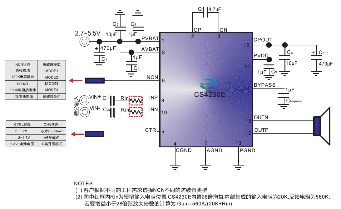 CS4230(內(nèi)置無電感電荷泵升壓4.8W防破音單聲道GF類音頻功放IC) |