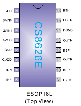 CS8626E提供纖小的ESOP16封裝形式供客戶(hù)選擇,可以為客戶(hù)節(jié)省可觀的PCB面積,其額定的工作溫度范圍為-40℃至85℃。