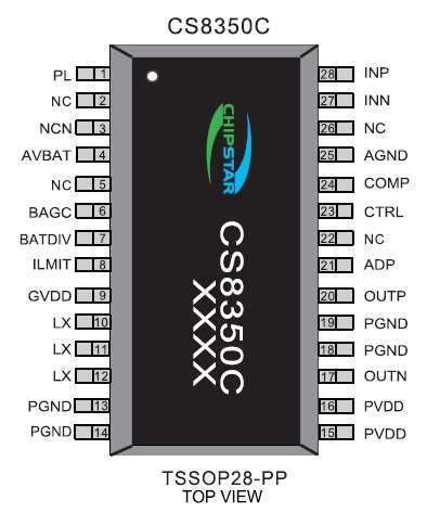 CS8350C的全差分架構(gòu)和極高的PSRR有效地提高對RF噪聲的抑制能力。無需濾波器的PWM調(diào)制結(jié)構(gòu)及內(nèi)置的BOOST升壓模塊 ,以及CS8350C采用專有的 AERC((Adaptive Edge Rate Control)技術(shù),在音頻全帶寬范圍內(nèi)極大地降低了EMI的干擾,對60cm的音頻線,在FCC的標準下具有超過20dB的裕量,另外CS8350C內(nèi)置了過流保護,短路保護和過熱 保護,有效的保護芯片在異常的工作條件下不被損壞。CS8350C提供了纖小的的TSSOP28-PP封裝形式供客戶 選擇,其額定的工作溫度范圍為-40℃至85℃。