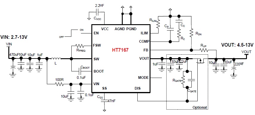 輸入電壓范圍VIN:2.7V-13V;輸出電壓范圍VOUT:4.5V-13V;內(nèi)部固定峰值電流:10A
