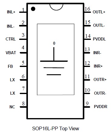 雙鋰電8.4V:2×30W/4歐(VOUT=16V, THD+N= 10%) 或雙鋰電8.4V:52W/3歐(VOUT=17V, THD+N= 10%) |