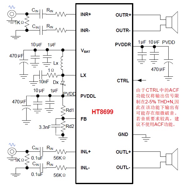兼顧12V適配器供電應(yīng)用,兩種防破音模式,擴(kuò)頻模式,內(nèi)置BOOST升壓模塊 單節(jié)鋰電池供電,恒定2 x 10W輸出功率R類立體聲音頻功率放大器 |