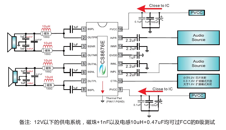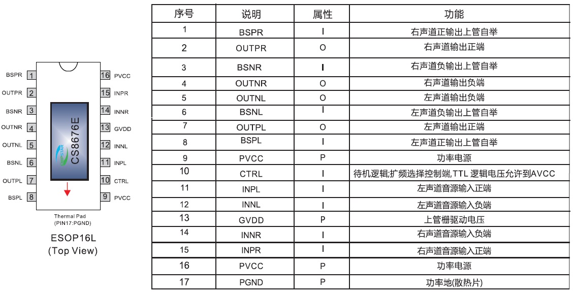 當前位置:首頁->產品展示->功放IC->CS8676(擴頻功能、低空載電流、免輸出電感、2X20W雙聲道/40W單聲道D類音頻功放IC) |