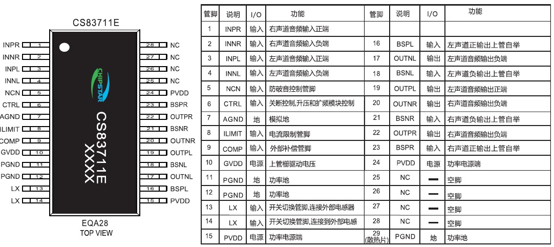 CS83711(兩節(jié)鋰電池7.4V供電內(nèi)置升壓2x16.5W雙聲道D類音頻功放IC) |