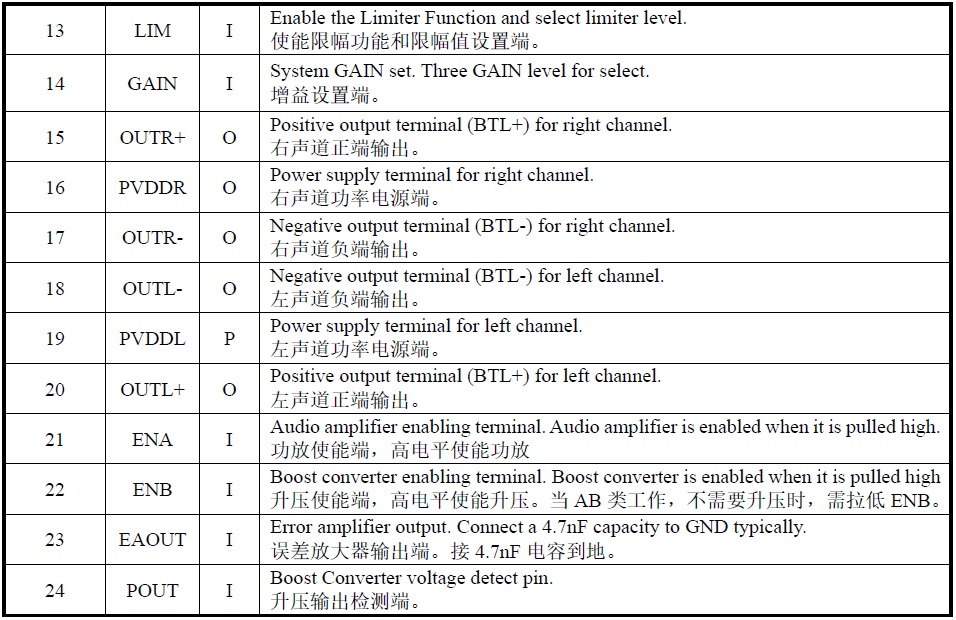 18W/3.0V-12V(內(nèi)置升壓至12.3V)/4Ω |
