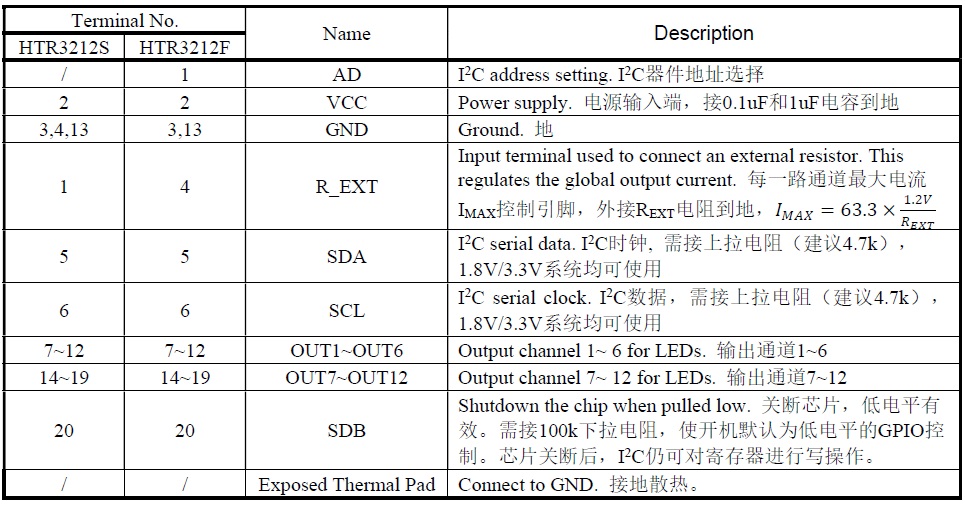 HTR3236是一款36路LED PWM驅動器,PWM頻率可固定為3kHz或22kHz。每一路最大輸出電流可通過外置電阻REXT調節(jié),最大38mA,并