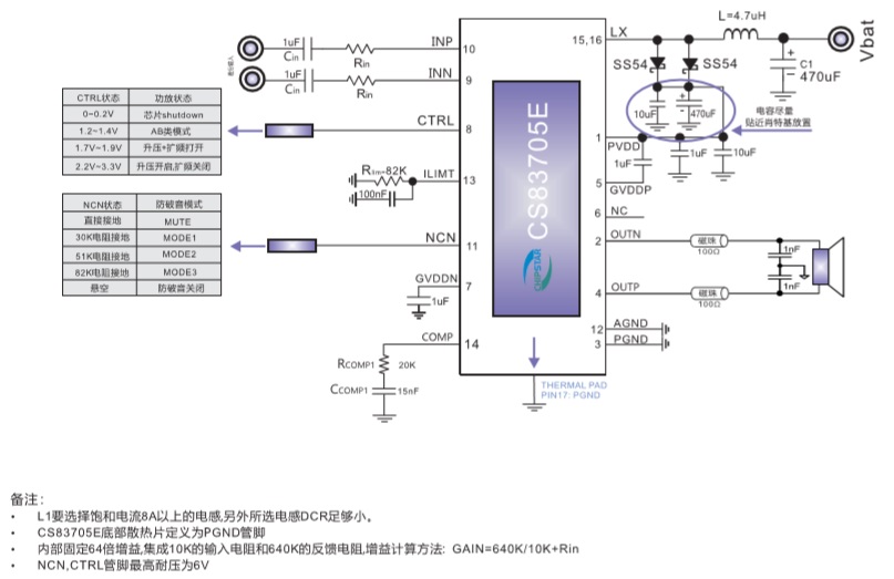 CS83705E的全差分架構(gòu)和極高的PSRR有效地提高對(duì)RF噪聲的抑制能力。無(wú)需濾波器的PWM調(diào)制結(jié)構(gòu)及內(nèi)置的BOOST升壓模塊,以及CS83705E采用專(zhuān)有的AERC((Adaptive Edge Rate Control)技術(shù),在音頻全帶寬范圍內(nèi)極大地降低了EMI的干擾,對(duì)60cm的音頻線,在FCC的標(biāo)準(zhǔn)下具有超過(guò)20dB的裕量,另外CS83705E內(nèi)置了過(guò)流保護(hù),短路保護(hù)和過(guò)熱保護(hù),有效的保護(hù)芯片在異常的工作條件下不被損壞。