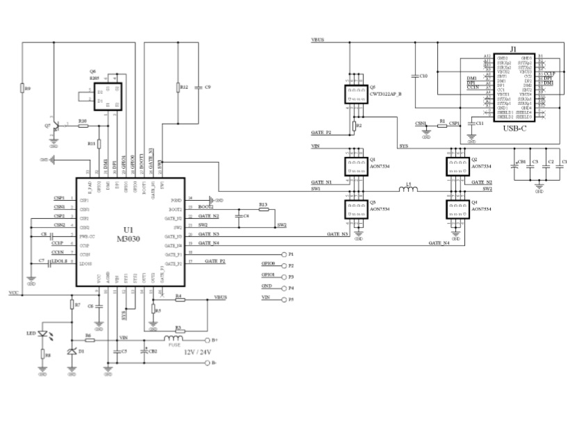 M3030 是一款面向車載充電器應(yīng)用的電源管理SOC,集成了雙向升降壓電壓變換器、16位高精度ADC、USB Type-C 接口、MOSFET 驅(qū)動(dòng)接口,兼容BC1.2 DCP、PD3.0/PPS、QC2.0、QC3.0、AFC、FCP、APPLE 2.4A 等流行的快充協(xié)議,支持過壓保護(hù)、過流 保護(hù)等完備的安全保護(hù)機(jī)制。 外圍僅需很少的元件,即可組成33W的車載充電器應(yīng)用方案