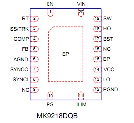 MK9218支持同步信號輸出和同步信號輸入,可使用兩顆芯片進行雙相降壓設計,滿足大電流輸出需要,輸入支持欠壓保護,芯片支持供電欠壓保護,支持過電流保護和過熱保護,采用增強散熱的QFN20L封裝,尺寸為4.5*3.5mm。