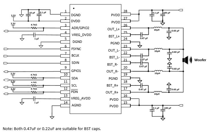 I2S數(shù)字輸入33W立體聲D類音頻功放芯片、內(nèi)置DSP小音量低頻增強(qiáng)等算法 |