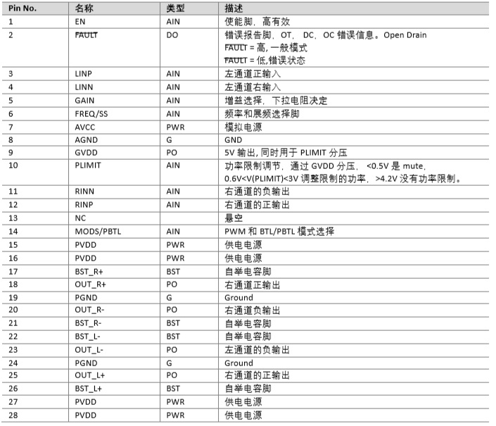 提供功率限制功能選項和喇叭直流保護功能,避免喇叭受到損傷。另外有短路保護功能,過溫保護,過壓,欠壓保 護等功能避免器件受到損傷.