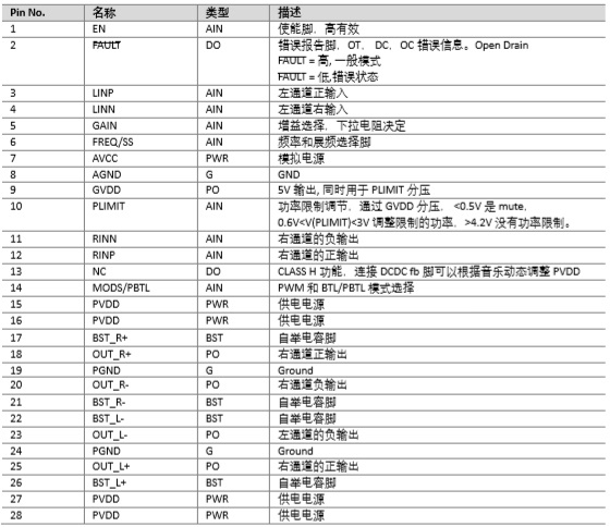 提供功率限制功能選項(xiàng)和喇叭直流保護(hù)功能,避免喇叭受到損傷。另外有短路保護(hù)功能,過溫保護(hù),過壓,欠壓保護(hù)等功能避免器件受到損傷。
