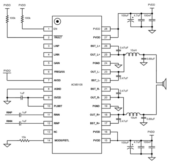 ACM3108 工作電壓范圍在4.5-16V,輸出配置可以立體聲BTL,也可以單通道PBTL。