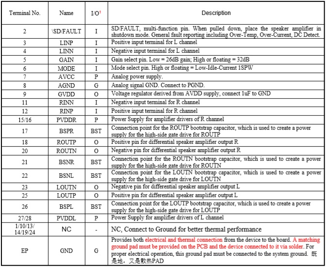 2×40W (VDD=24V, RL=8Ω, THD+N=10%)