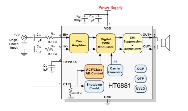 HT6881內(nèi)部集成免濾波器數(shù)字調(diào)制技術(shù),能夠直接驅(qū)動(dòng)揚(yáng)聲器,并最大程度減小脈沖輸出信號(hào)的失真和噪音。輸出無需濾波網(wǎng)絡(luò),極少的外部元器件節(jié)省了系統(tǒng)空間和成本,是便攜式應(yīng)用的理想選擇。 此外,HT6881內(nèi)置的關(guān)斷功能使待機(jī)電流最小化,還集成了輸出端過流保護(hù)、片內(nèi)過溫保護(hù)和電源欠壓異常保護(hù)等功能。