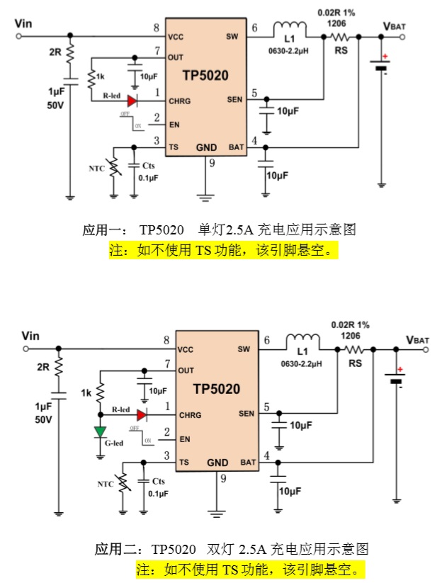 TP5020是一款輸入電源32V高耐壓具備OVP保護功能完整的降壓同步開關型單節(jié)鋰電池充電管理芯片。其ESOP-8L/DFN3*3-8L的封裝與簡單的外圍電路,使得TP5020非常適用于便攜式設備的大電流充電管理應用。同時TP5020內置、輸入欠壓保護、輸入過壓保護、芯片過溫保護、充電電池溫度檢測、BAT端短路保護、充電安全定時時間、EN 使能端等功能。 TP5020具有寬輸入電壓,對電池充電分為0V充電電流、涓流預充、恒流、恒壓階段, 恒流充電電流都通過外部電阻調整,最大充電電流達2.5A。TP5020采用頻率1.5MHz的開關工作模式使它可以使用較小的外圍器件,并在大電流充電中仍保持較小的發(fā)熱量。TP5020內置降壓功率MOSFET、防倒灌電路,所以無需防倒灌肖特基二極管等外圍保護。