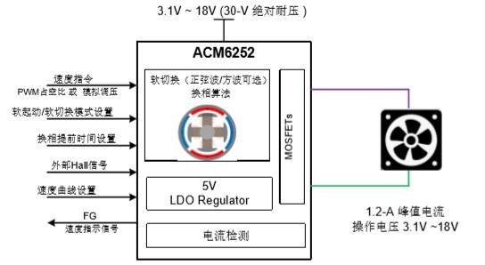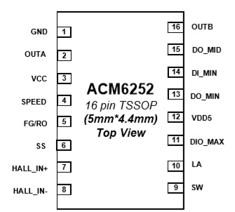 ACM6252是一款內(nèi)置H橋功率MOS管的單相無(wú)刷電機(jī)驅(qū)動(dòng)芯片. ACM6252支持可以調(diào)整的速度曲線,正弦波驅(qū)動(dòng)保證直流風(fēng)扇靜音高效.