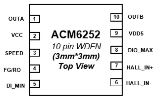 ACM6252可以在外部供電3.1~18V 范圍電壓下驅(qū)動(dòng)一個(gè)單相直流無(wú)刷電機(jī), 峰值電流驅(qū)動(dòng)能力可以達(dá)到1.2A.