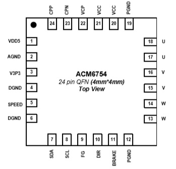 ACM6754支持多種速度控制.外部PWM占空比調(diào)速、外部模擬電壓調(diào)速、I2C寄存器調(diào)速以及外部PWM頻率調(diào)速.