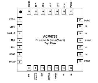 ACM6763是一款三相無刷直流電機(jī)驅(qū)動芯片,內(nèi)部集成 無感三相無刷電機(jī)驅(qū)動算法、相電流檢測電流電路、柵極驅(qū)動電路以及功率MOS管. 支持最大5A的相電流.