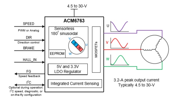 ACM6763 的高集成度以及精簡外圍特別適用于高功率密 度、小尺寸、靜音要求高的三相無刷電機(jī)驅(qū)動器應(yīng)用場景.