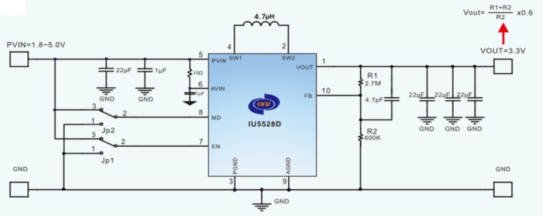 IU5528D由電流模PWM控制環(huán)路,誤差放大器,比較器和功率開關等模塊組成。該芯片可在較寬負載范圍內(nèi)高效穩(wěn)定的工作.IU5528D的輸入電壓為1.8V至5.0V提供可調(diào)輸出電壓為(1.2V至5V) .在輸出電壓為3.3V的情況下, 輸入從3.0V到5.0V,它能提供最大2.6A的負載電流. IU5528D可以通過調(diào)整兩個外加電阻來設定輸出電壓.