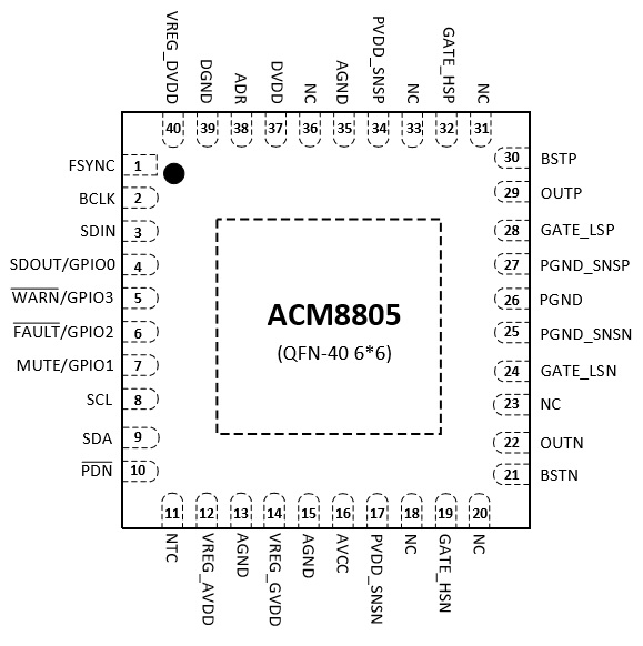 ACM8805是一款具有數(shù)字輸入的單通道D類音頻功放控制器,帶有5V柵極驅(qū)動(dòng)器,用于驅(qū)動(dòng)外部GaN HEMT或MOSFET。外圍應(yīng)用電路只需很少的元件就可在4.5V至80V的PVDD電源、3.3V或1.8V的DVDD電源下工作。