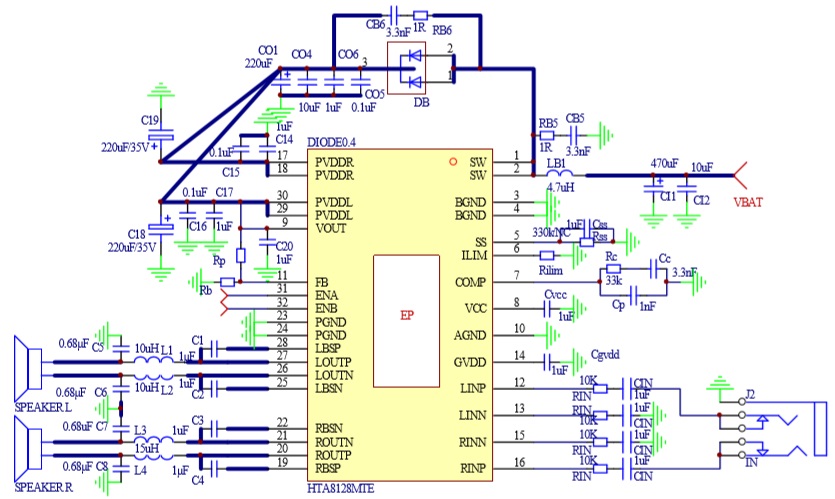 此外,HTA8128內(nèi)部集成免濾波器調(diào)制技術(shù), 能夠直接驅(qū)動(dòng)揚(yáng)聲器,內(nèi)置的關(guān)斷功能使待機(jī)電流最小化,還集成了輸出端過(guò)流保護(hù)、片內(nèi)過(guò)溫保護(hù)、輸入電源欠壓異常保護(hù)、升壓電壓過(guò)壓保護(hù)等功能。