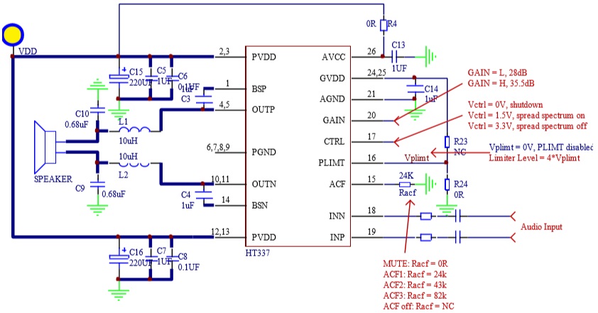 HT337具有防削頂失真(ACF)輸出控制功能,可檢測(cè)并抑制由于輸入音樂(lè)、語(yǔ)音信號(hào)幅度過(guò)大所引起的輸出信號(hào)削頂失真(破音), 也能自適應(yīng)地防止在電源電壓下降所造成的輸 出削頂,顯著提高音質(zhì),創(chuàng)造非常舒適的聽(tīng)音享受,并保護(hù)揚(yáng)聲器免受過(guò)載損壞。