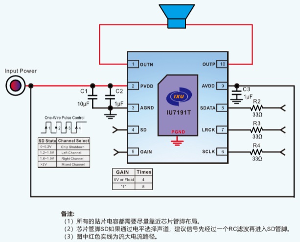 IU7191T為單聲道音頻功放。但通過SD管腳設(shè)置不同的電平或者一線脈沖輸入,這兩種方式可以進行左/右/混合三種聲道的選擇。因此可同時選用兩顆芯片,靈活地組成立體聲產(chǎn)品。