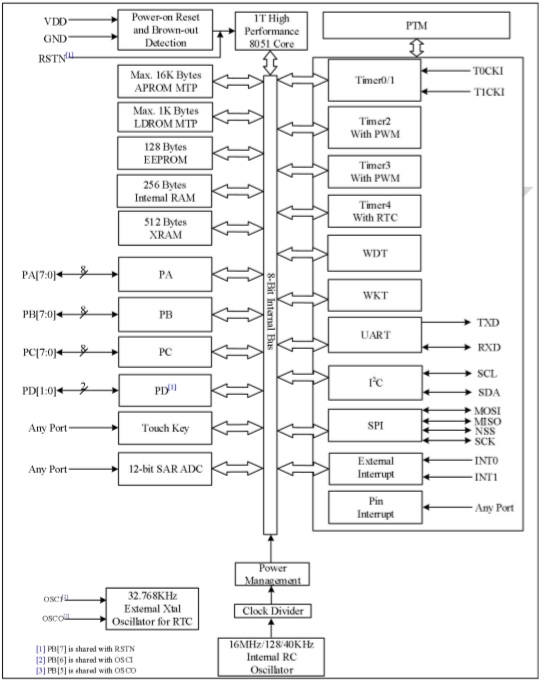 ┄ Timer0/1/2/3/4、WDT、WKT、ADC、PWM、UART、SPI、I2C、TK、LVD 中斷源