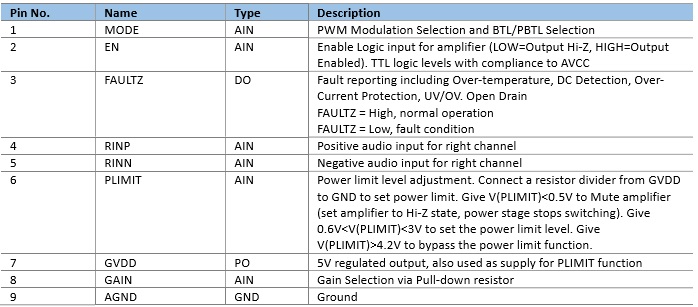 ACM3156工作電壓范圍在 4.5-34V,輸出配置可以立體聲BTL,也可以單通道PBTL。