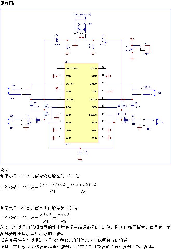 對(duì)于便攜式播放器及小音響來說,由于喇叭尺寸的限制,它們的低頻響應(yīng)通常都很差,而人耳又偏偏對(duì)于低頻的音樂反映不敏感。有必要在電子線路上想辦法,解決這一問題。低音增強(qiáng),它的實(shí)現(xiàn)方法是在反饋回路中,通過增加電容,來實(shí)現(xiàn)低頻部分的增益大于通帶內(nèi)的增益,從而為揚(yáng)聲器提供非常不錯(cuò)的低音效果,將從根本上改變揚(yáng)聲器低頻表現(xiàn)較差的現(xiàn)狀。以LM4863為例,原理如下: