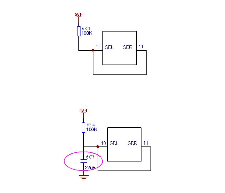 方法一:D類功放IC關(guān)斷腳SDL和SDR對GND接電容(見下圖)。