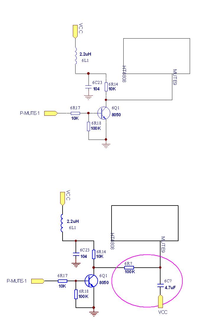 方法二:修改D類音頻IC的MUTE端部分外圍(具體修改方法見下圖中紅色圓圈內(nèi)部分內(nèi)容)。