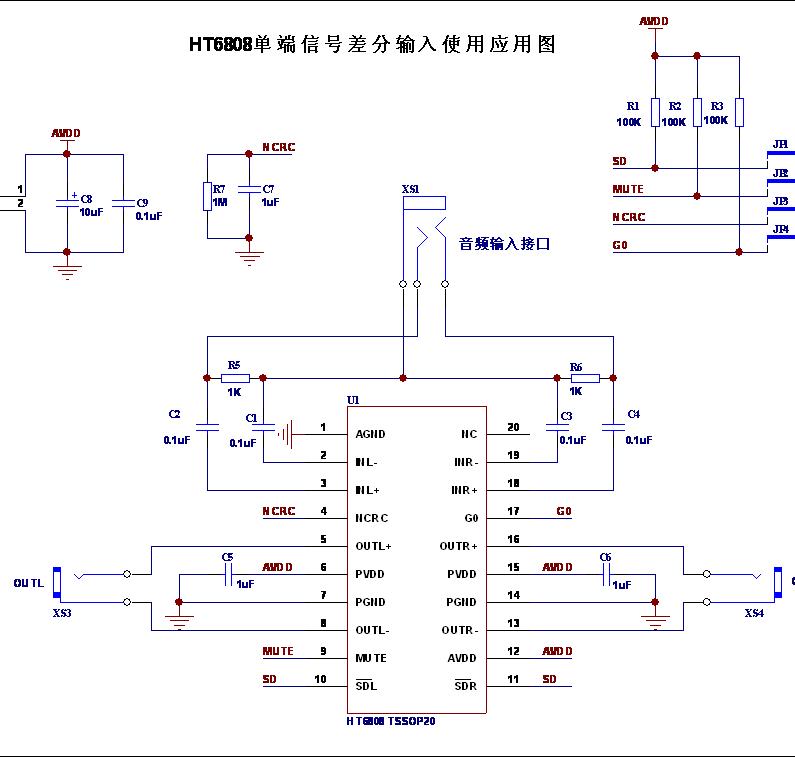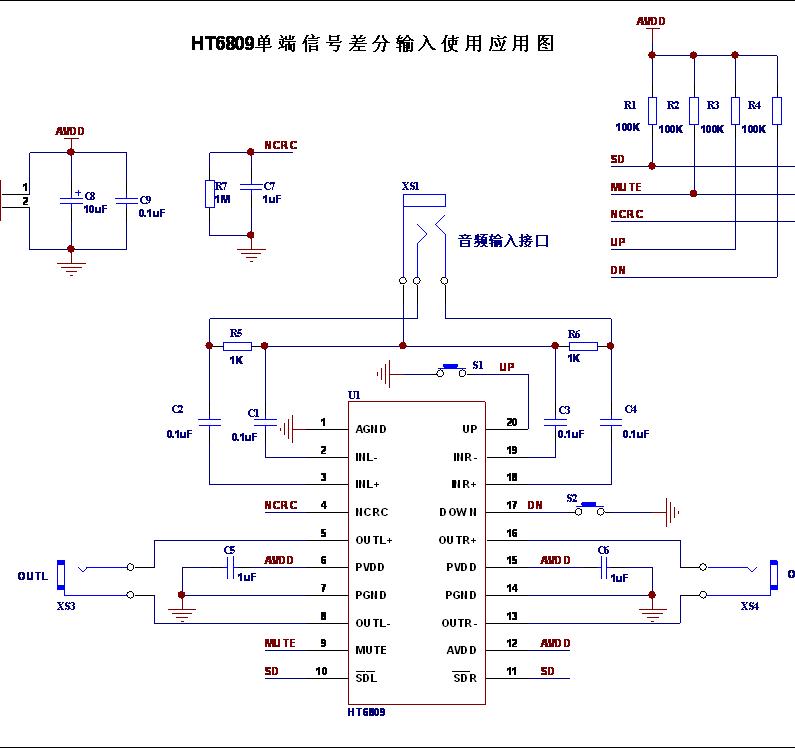 USB音箱使用電腦USB接口供電,同時(shí)電腦提供音源時(shí),音箱一般輸出噪聲較大。同樣一款音箱,換用其他電腦的USB或鋰電池供電時(shí)輸出噪聲會(huì)降低,這個(gè)現(xiàn)象在市場(chǎng)上的USB音箱中普遍存在。該現(xiàn)象是由回路噪聲引起的,當(dāng)信號(hào)源和電源使用同一個(gè)GND時(shí)就會(huì)出現(xiàn)回路噪聲,使用兩路獨(dú)立的電源可以解決這個(gè)問題。電腦聲卡本身發(fā)出一定的噪聲,加上電腦整機(jī)系統(tǒng)比較復(fù)雜其GND會(huì)受到干擾也會(huì)產(chǎn)生噪聲,經(jīng)過功放放大后,噪聲更加明顯。這個(gè)噪聲通常市場(chǎng)上普遍應(yīng)用的單端輸入的功放IC都無法避免,但是使用差分輸入的方法在不需使用兩路獨(dú)立的電源的情況下是可以解決這個(gè)問題。HT6808/HT6809既可以單端輸入,同時(shí)也可以使用差分信號(hào)做差分輸入使用,通過將單端信號(hào)使用差分輸入,從而解決回路噪聲的問題。