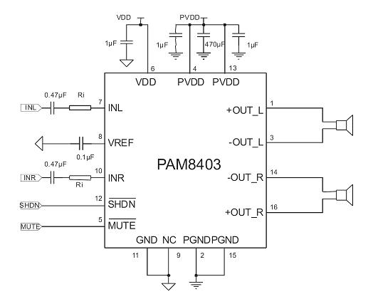 PAM8403/CS8403是高性能CMOS音頻放大器,需要足夠的電源退耦以保證輸出THD和PSRR盡可能小。電源的退耦需要兩個不同類型的電容來實現(xiàn)。為了更高的頻率響應和減小噪聲,一個適當?shù)刃Т?lián)電阻(ESR)的陶瓷電容,典型值1.0uF,放置在盡可能靠近器件VDD端口可以得到最好的工作性能。為了慮除低頻噪聲信號,推薦放置一個20uF(陶瓷電容)或更大的電容在靠近音頻放大器出。