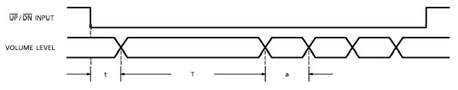 音量上升,下降由UP,DOWN鍵輸入控制。UP/DOWN輸入低電平一次,音量隨之上升/下降一級;連續(xù)置低,音量可連續(xù)變化。