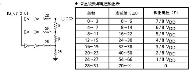 音量電平計(jì)量器直流輸出在內(nèi)部連接到數(shù)模轉(zhuǎn)換器(R/2R型)。通過音量電平產(chǎn)生八級輸出電壓。由于輸出阻抗≈22KΩ(典型)是高電平,如果輸入阻抗緊接著被設(shè)置為低電平,則必須設(shè)置緩沖器。