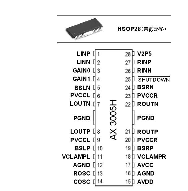 AX3005是一款用于驅(qū)動(dòng)橋接立體聲揚(yáng)聲器、每聲道10W的高效D類音頻放大器。它可以驅(qū)動(dòng)低至8Ω的立體聲揚(yáng)聲器。當(dāng)播放音樂(lè)時(shí),由于AX3005的高效率,因此不需要額外的散熱片。放大器的增益由兩個(gè)增益選擇端控制?蛇x的增益包括15.3、21.2、27.2和31.8 dB。電路具有輸出短路保護(hù)功能,可防止輸出端到電源、地及其它輸出端的短路。熱保護(hù)功能可保證芯片不會(huì)超過(guò)最大結(jié)溫。本文就其產(chǎn)品特點(diǎn)及應(yīng)用原理進(jìn)行說(shuō)明
