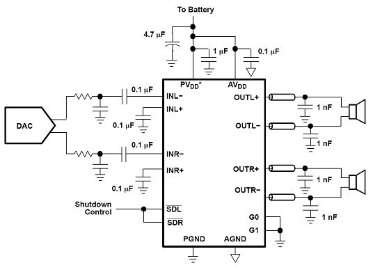 TPA2012D2的每個(gè)聲道都可以獨(dú)立關(guān)斷控制。使用G0和G1兩個(gè)增益選擇的引腳,可選擇6,12,18或24dB的增益。高的PSRR和差分結(jié)構(gòu)提高了它對(duì)噪音和RF整流器的抗噪性。除了以上特征外,快速的啟動(dòng)時(shí)間和小的封裝尺寸使得2012成為小型手上設(shè)備和PDA的最佳選擇。
