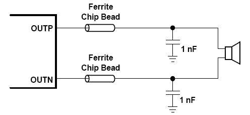 如果電路對(duì)于低頻(<1MHz)的電磁干擾比較敏感,或者放大器和喇叭之間有較長(zhǎng)的導(dǎo)線,可以使用一個(gè)LC輸出濾波器。下圖是典型的磁環(huán)和LC輸出濾波器。