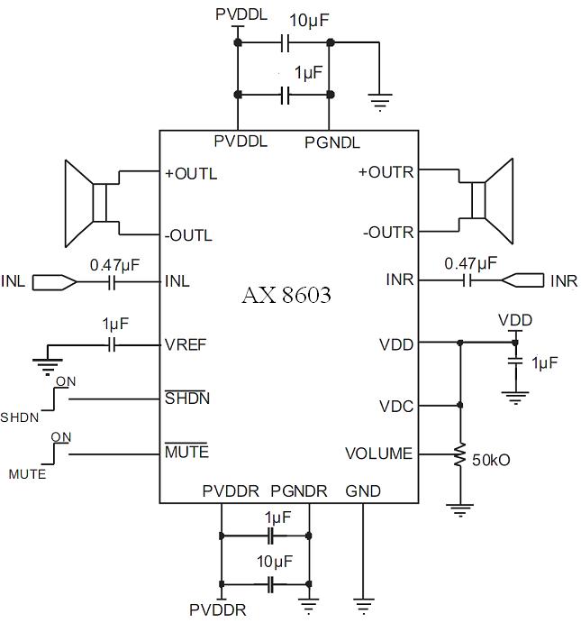 1. 當PAM8603工作在無濾波器時,必須先接通揚聲器再接通電源,否則容易對芯片造成損壞。