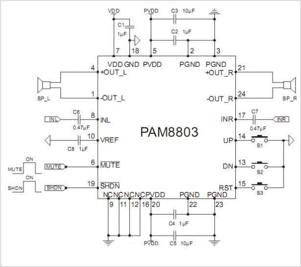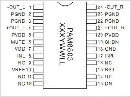 PAM8803是一款帶64級(jí)電子音量控制的3 W 立體聲D 類音頻功率放大器,能夠以D 類放大器的效率提供AB 類功率放大器的性能。采用D 類結(jié)構(gòu),PAM8803能夠以高于90 %的效率提供3 W功率。新型的無濾波器結(jié)構(gòu)可以省去傳統(tǒng)的D類放大器輸出低通濾波器,從而節(jié)省了系統(tǒng)成本和PCB 空間,是便攜式應(yīng)用的理想選擇。PAM8803工作電壓2.5V-5.5V,采用SSOP-24 封裝。市場上TA8803與其管教兼容。