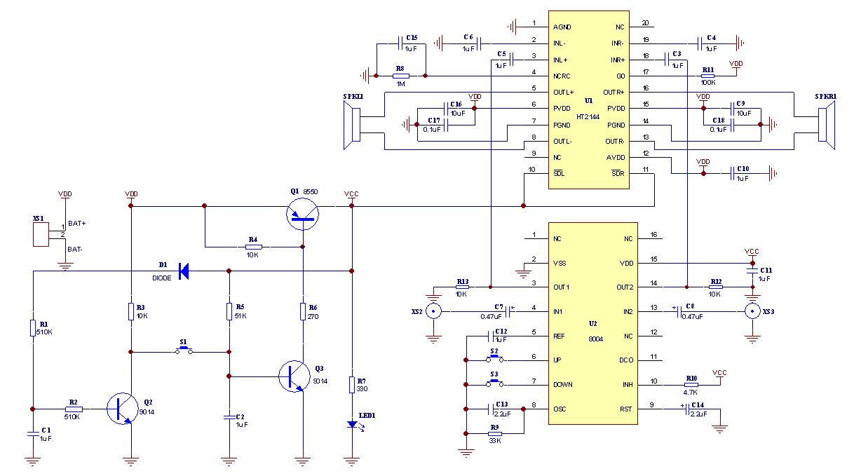 說(shuō)明:S1為鍋?zhàn)虚_(kāi)關(guān),可以控制HT2144和CSC8004是否工作。由于該結(jié)構(gòu)輸出電流有限,而HT2144工作時(shí)需要較大的電流,所以鍋?zhàn)虚_(kāi)關(guān)控制的是CSC8004的電源電壓和HT2144的關(guān)斷電壓(而不是電源電壓,這一點(diǎn)需注意)。由于HT2144是低電平關(guān)斷,所以鍋?zhàn)虚_(kāi)關(guān)不工作時(shí),HT2144關(guān)斷電平為低,處于關(guān)斷狀態(tài),此時(shí)靜態(tài)電流小于1uA,效果與控制電源電壓一致。按下鍋?zhàn)虚_(kāi)關(guān)后,CSC8004接通電源,HT2144則處于正常工作模式,系統(tǒng)可以正常工作。