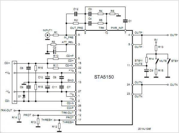 每個(gè)STA5150器件都包括一個(gè)200W的音頻功率放大器通道,這個(gè)放大器主要用于多聲道音響系統(tǒng),如視聽接收機(jī)中常用的5.1聲道環(huán)繞聲,F(xiàn)有其它的配備BASH的音頻功放包括2x100 STA575、2x70W STA550 和可以配置成4x50W 到 2x50W+ 1x100W的四通道功放STA530。這些功放配合一個(gè)數(shù)字處理器STABP01工作,這個(gè)處理器通過從功放級(jí)傳來的參考反饋信號(hào),可以控制一個(gè)降壓變換器,實(shí)現(xiàn)BASH電源電壓變化技術(shù)。