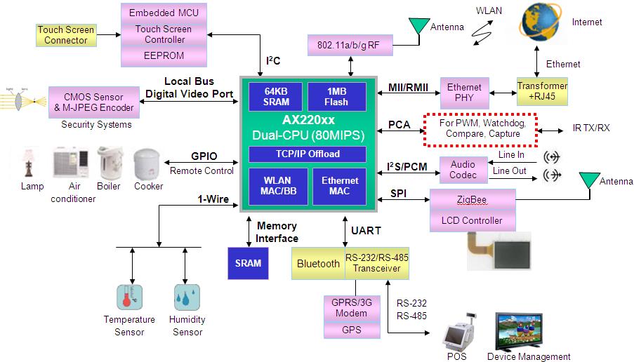 AX220xx內(nèi)建802.11無線局域網(wǎng)MAC/基帶的單芯片TCP/IP微處理器,提供高性能雙CPU內(nèi)核及1MB 共享閃存用于程序存儲,內(nèi)嵌用于主處理器(MCPU)的64KB 數(shù)據(jù)存儲器及用于Wi-Fi處理器(WCPU)的32KB數(shù)據(jù)存儲器,內(nèi)建TCP/IP加速器,兼容于802.11a/b/g的MAC/基帶,高速以太網(wǎng)MAC及豐富的通信外圍設備。