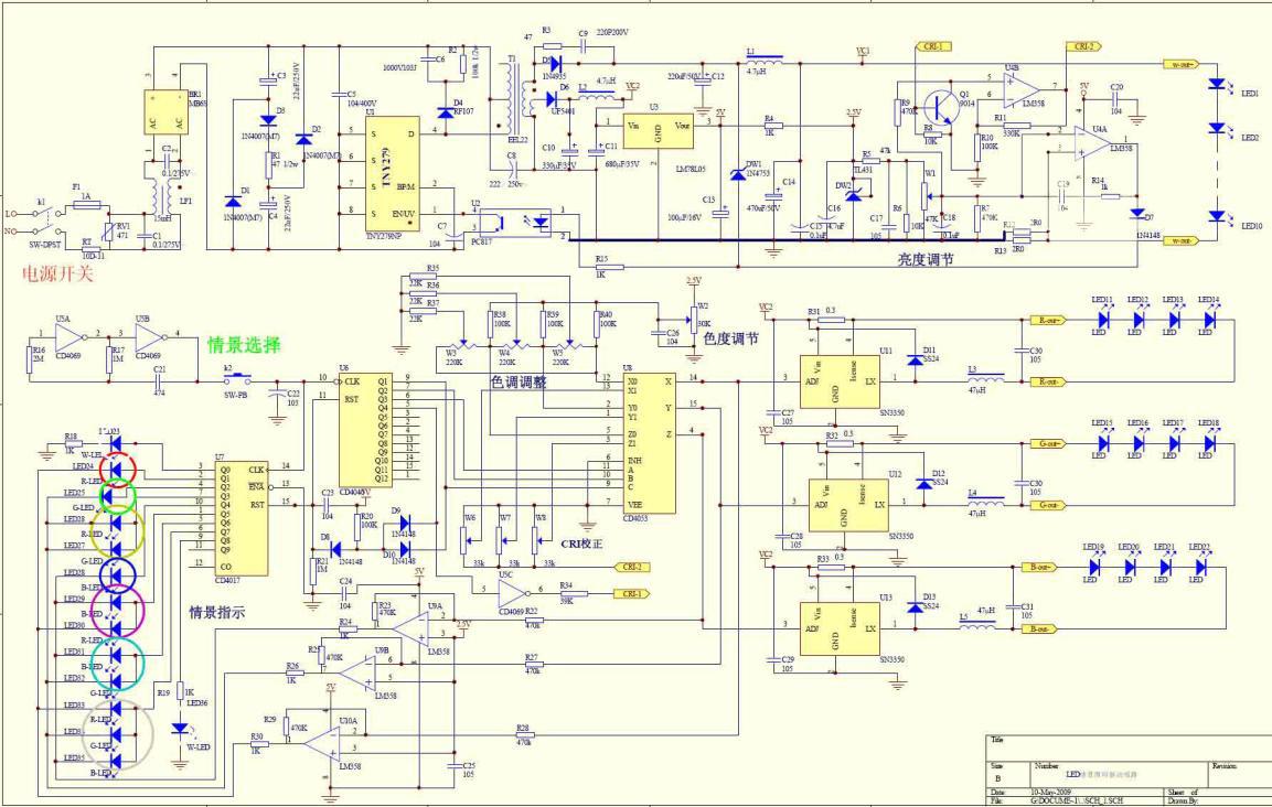 簡述一下情景照明LED驅(qū)動線路主電源電路的設(shè)計思路,電路如上圖。主電源電路輸出分為兩路: