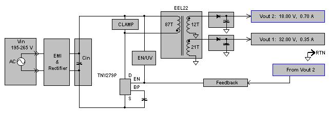 情景照明LED驅(qū)動線路設(shè)計,主電路選用PI公司TinySwitch-III系列的一個器件TNY279P,電路結(jié)構(gòu)相對簡單,并有較高電源效率,在滿功率輸出時,PI軟件估計電源效率為82%,電路采用反激式轉(zhuǎn)換器模式,隔離輸出,保證了使用操作的安全性,驅(qū)動電路為白光LED負載提供穩(wěn)定電流輸出并為彩燈驅(qū)動提供一穩(wěn)定電壓電源,電路總輸出功率為24W(白光10W+彩色3*4W)。 主電源采用PI電源芯片TinySwitch-III系列,電路結(jié)構(gòu)及變壓器設(shè)計采用PI公司電源設(shè)計軟件,設(shè)計結(jié)果如下: