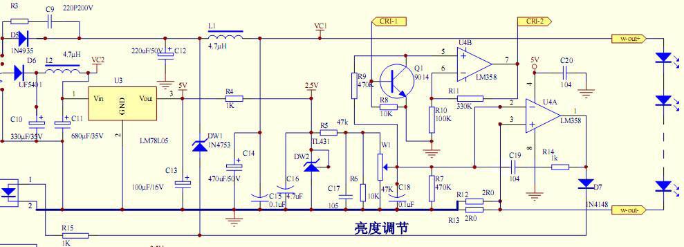 一路輸出為VC1,用于白光LED驅(qū)動,電阻R12、R13為白光LED電流檢測電阻,電位器W1是亮度調(diào)節(jié)電位器,可調(diào)節(jié)預(yù)置一定的電壓,運放U4a用于比較電位器W1電壓和電阻R12、R13的電壓,其輸出通過光耦反饋來調(diào)節(jié)輸出電流的大小,亦即調(diào)節(jié)白光LED的亮度。DW1用于電路輸出電壓控制,防止LED負載或電位器為W1開路而使驅(qū)動電路輸出高電壓,Q1和U4B是用于跟蹤電位器W1電壓變化而相應(yīng)輸出電壓變化的可控的電路,其輸出電壓用于控制彩色LED的功率輸出,目的是提高LED燈具出光顯色性指數(shù),補償單白光LED顯色性指數(shù)偏低的缺陷;